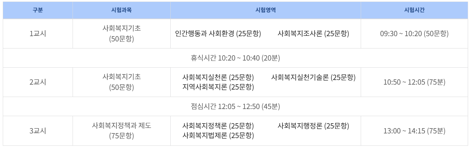 사회복지사1급 시험은 총 3교시 총 200분 (1교시: 50분, 2교시: 75분, 3교시: 75분)으로 진행되며 과목은 8과목으로 객관식 5지 택일형, 총 200점 만점입니다.